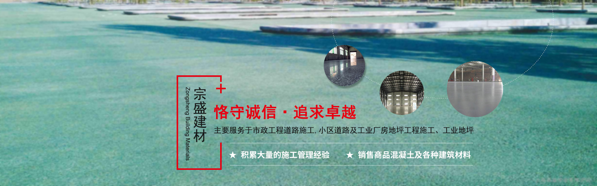 杭州宗盛建材有限公司是一家专业从事商品混凝土生产销售和工业地坪施工的高新企业。主要服务于市政工程道路施工,小区道路及工业厂房地坪工程施工、工业地坪包括混凝土素地坪,金刚砂耐磨地坪,环氧树脂地坪,自流平地坪,超平地坪,模压地坪,塑胶运动场、绿化道路养护等业务。并承接各种建筑工程,钢结构工程,销售商品混凝土及各种建筑材料,公司引进国内外先进施工设备,混凝土搅拌站、进口摊铺机、压路机、铣刨机、胶轮压路机、挖掘机等大型高新施工机械设备数台(套)。